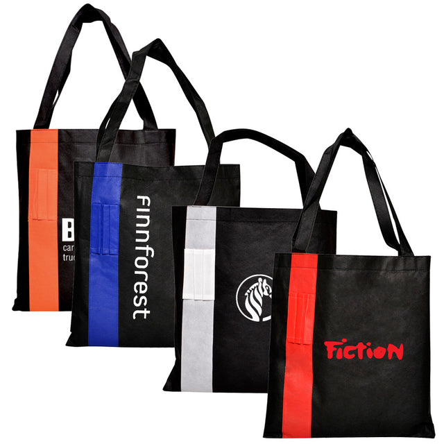 This tote is made Of 80 Gram Non-Woven, Features of 3 front pen loops.Perfect item for trade show ,and conference .