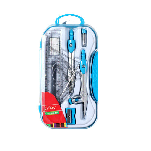 Juego de geometría de 10 piezas, ideal para matemáticas. Caja de plástico con 2 compases autocentrantes, lápiz, mina de repuesto, regla de 15 cm, transportador, 2 escuadras, borrador y sacapuntas. La regla, el transportador y las escuadras transparentes permiten ver el trabajo en la página. Caja de plástico transparente con detalles de color. Todo organizado en una caja de plástico fácil de transportar.