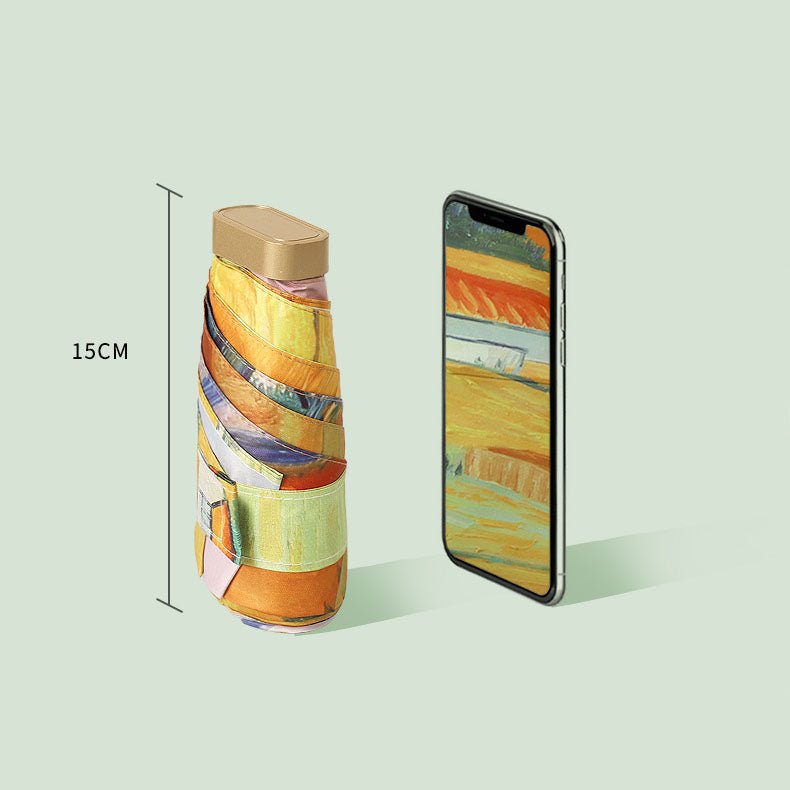 Ce parapluie a un petit boby mais joue un grand rôle pour vous.Plié avec une taille de seulement 6" de long.Facile à mettre dans votre sac à main.Pour vous protéger de la pluie et du soleil.L'art sera mis sur toute la face du parapluie.Poignée dorée avec l'intérieur imprimé en noir et imprimé en couleur sur le dessus à l'extérieur.L'autre motif est imprimé en or sur la face supérieure et imprimé en taille réelle à l'intérieur.