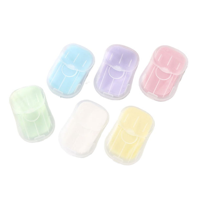 Une boîte contenant 50 tranches de savon au parfum d'eucalyptus. Utilisé pour nettoyer la peau des mains lors de voyages, de voyages d'affaires, de pique-niques, etc. ; petit et portable, peut se nettoyer les mains à tout moment.